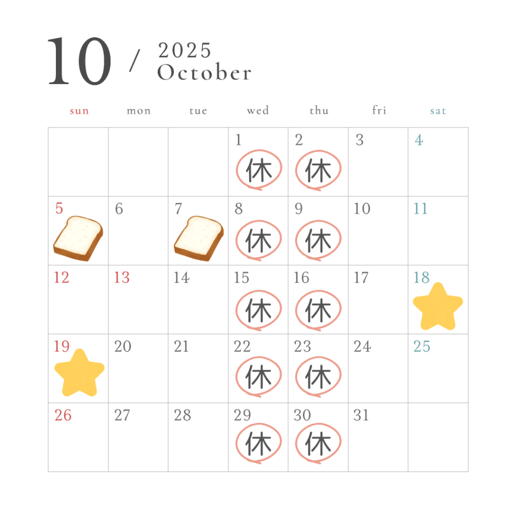 News 2025.09.30 🤍10月の定休日のお知らせ🤍 10月の定休日のお知らせです。水曜日と木曜日が定休日です。 10/5(日)が島田店、10/7(火)が本店の食パンの日です。500円以上お買い上げの方に次回使える食パン半額券をお渡しします。 10/5(日)は小松基地航空祭です!航空祭にパンあづま屋の商品もございます!参加される方は、ぜひチェックしてみてください。 また、10/12(日)は小松駅前にて「どんどん祭り」に出店します。 次の記事次の記事 記事一覧